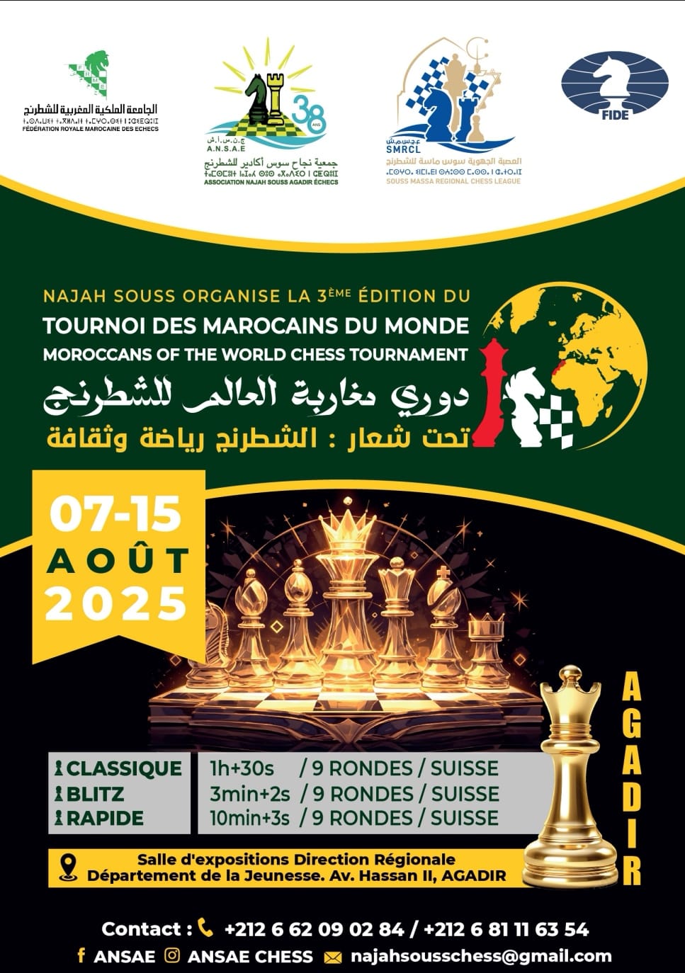 تستعد مدينة أكادير لاحتضان حدث رياضي وثقافي مميز خلال فصل الصيف، حيث تنظم جمعية نجاح سوس أكادير للشطرنج، بشراكة مع المديرية الجهوية لقطاع الشباب بسوس ماسة، النسخة الثالثة من دوري مغاربة العالم في الشطرنج”، وذلك خلال الفترة الممتدة من 7 إلى 15 غشت 2025، تحت شعار “الشطرنج رياضة وثقافة”