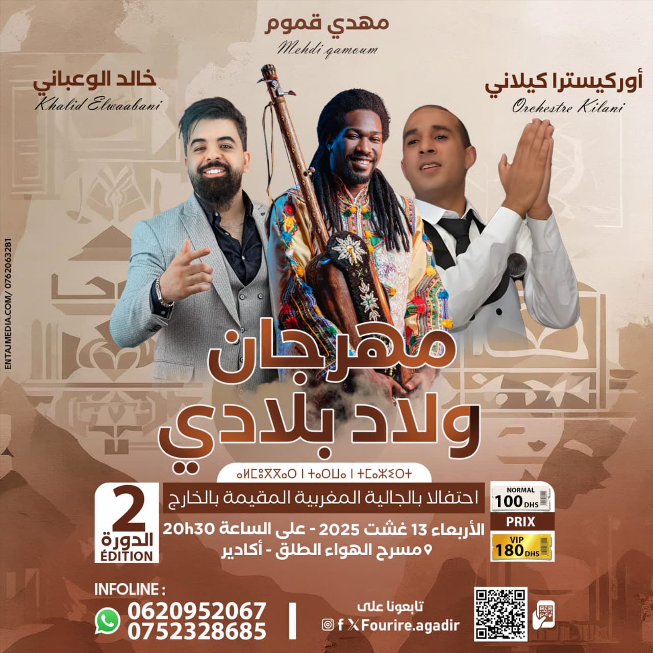 تستعد مدينة أكادير لاحتضان فعاليات الدورة الثانية من مهرجان ولاد بلادي”، وذلك يوم الأربعاء 13 غشت 2025، ابتداءً من الساعة الثامنة والنصف مساءً، بمسرح الهواء الطلق، في إطار احتفالات الجالية المغربية المقيمة بالخارج.