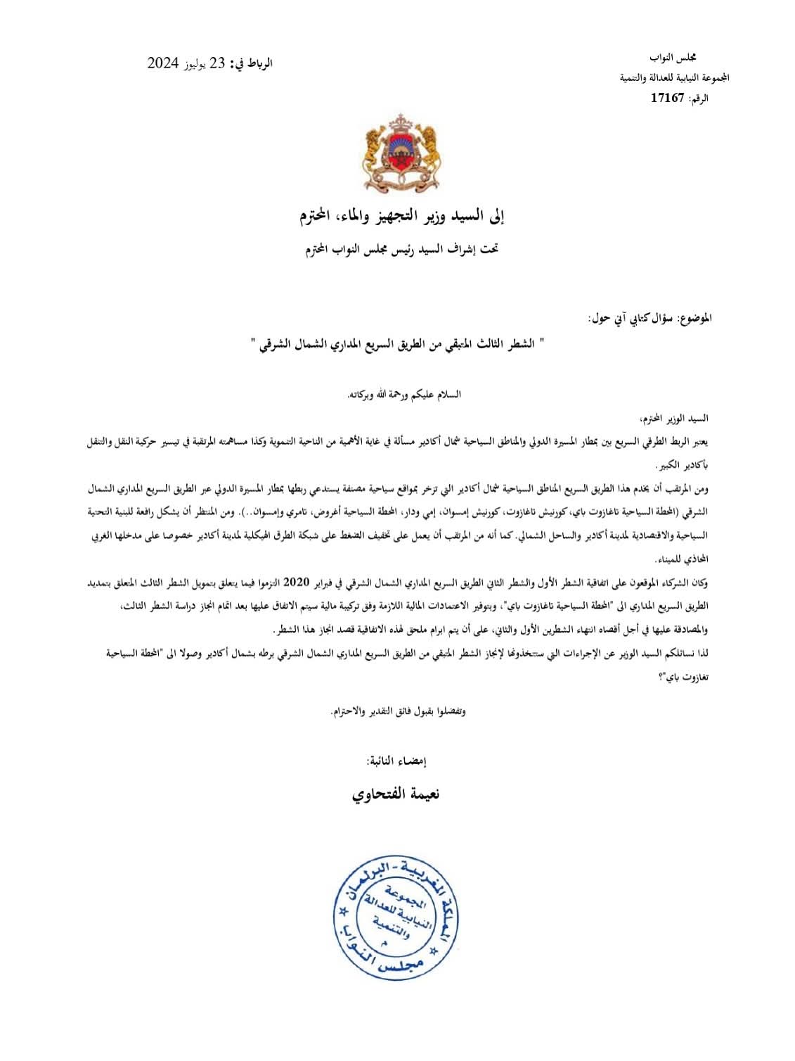 وأكدت الفتحاوي النائبة البرلمانية، وفق سؤالها الكتابي، الذي نشرته على صفحتها الرسمية، أنّ التأخير في استكمال هذا المشروع الحيوي، الذي يربط الطريق المداري الشمالي الشرقي بالمنطقة السياحية لتغازوت على طول 15 كيلومترا، بات يفاقم معاناة السائقين والساكنة والسياح مع الاختناق المروري، خصوصا في فصل الصيف. وقد بلغ صدى هذه الاختناقات حدّ تدويل الموضوع، بعدما عانى رئيس الاتحاد الدولي لكرة القدم (فيفا)، جياني إنفانتينو، من الازدحام خلال زيارة حديثة للمنطقة.
