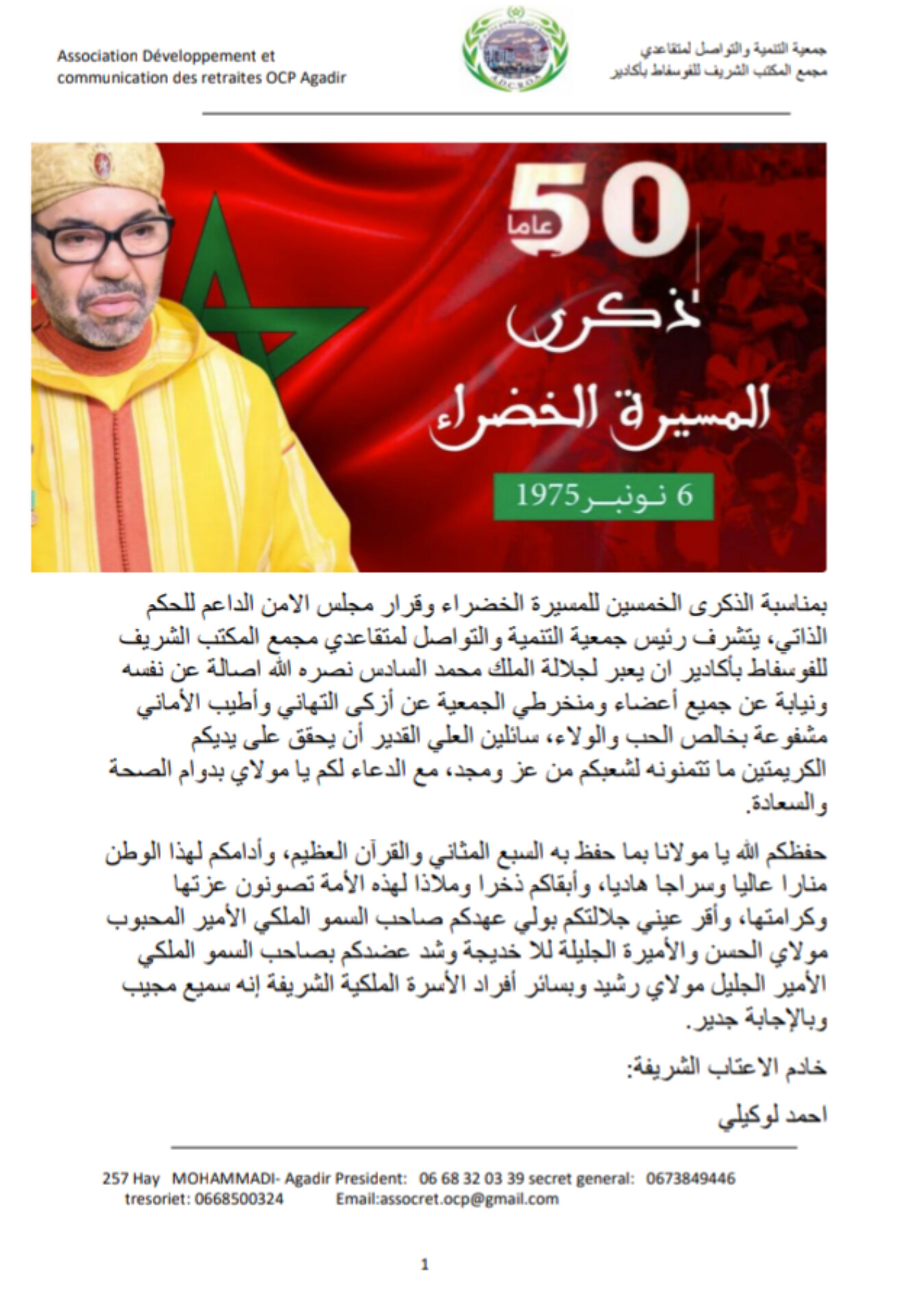 وبهذه المناسبة، عبّر رئيس الجمعية عن خالص عبارات الولاء والإخلاص للعرش العلوي، سائلاً العلي القدير أن يحفظ الملك محمد السادس ويمتعه بموفور الصحة والعافية، كما رفع باسم أعضاء ومتقاعدي المجمع أسمى التهاني والتبريكات بمناسبة تخليد هذه الذكرى الوطنية الغالية.