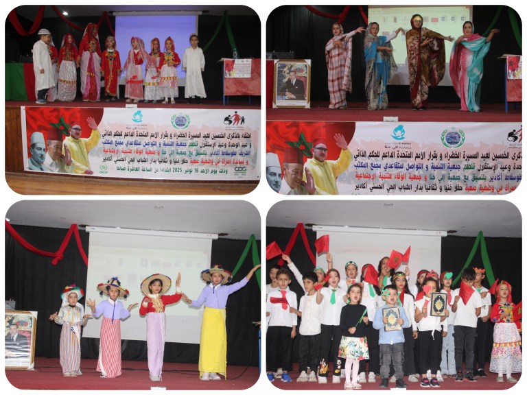 احتضنت قاعة الندوات التابعة لدار الشباب الحي الحسني بمدينة أكادير، يوم الأحد 16 نونبر 2025، حفلاً فنياً وثقافياً مميزاً، نظمته جمعية التنمية والتواصل لمتقاعدي مجمع المكتب الشريف للفوسفاط بأكادير، بشراكة مع جمعية إلي حنا وجمعية الوفاء للتنمية الاجتماعية ومساندة المرأة في وضعية صعبة، وذلك احتفاء بالذكرى الخمسين للمسيرة الخضراء المظفرة وبقرار الأمم المتحدة الداعم لمبادرة الحكم الذاتي، إلى جانب تخليد أعياد الوحدة والاستقلال.